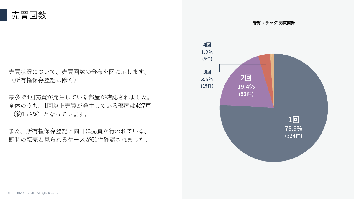 登記データから、これまでに1回以上売買が発生している戸数は427戸(調査対象の約15.9%)に上ることが判明しました。最多で4回の売買が発生している部屋も確認されています。