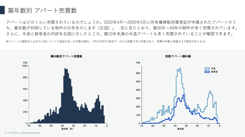 2022年4月〜2025年3月に所有権移転売買登記が申請されたアパートのうち、築年数が判明している物件の分布を見ると、築30年〜40年の物件が多く売買されていることがわかります。 さらに、木造と鉄骨造の内訳では、築10年未満の木造アパートも多く売買されていることが確認できます。