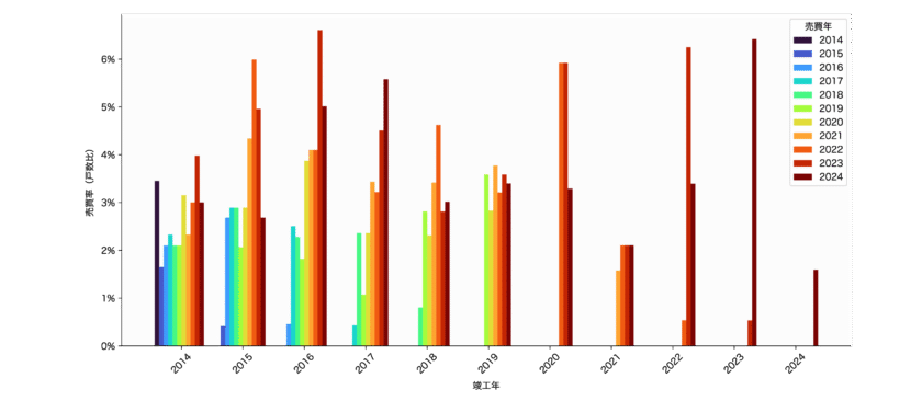 千代田区で2014年以降に竣工した分譲マンションについて、竣工年別・所有権移転売買年別の売買率を見ると、売買年が近年になるほど、売買取引が活発化している傾向がうかがえます。この背景には、新築マンションの供給減少に伴う中古物件への需要の高まりや、それに起因する価格上昇など、不動産市場全体が取引を加速させる環境に変化している可能性が考えられます。