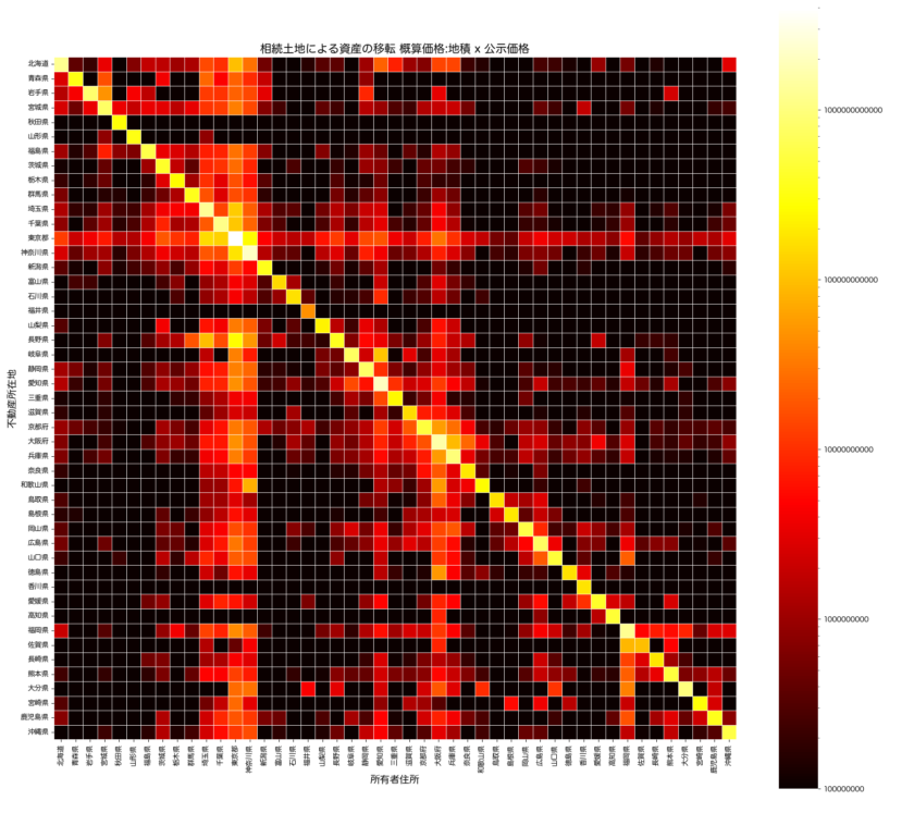 対角線(同一都道府県内での相続)が最も明るく、地元居住者による所有がもっとも多くなっている他に、対角線の周りにも比較的明るいブロックが見られます。首都圏や近畿圏など、隣接する県での居住が多くなっており、これは就職や結婚等による近距離の転居に伴う相続の結果と考えられます。