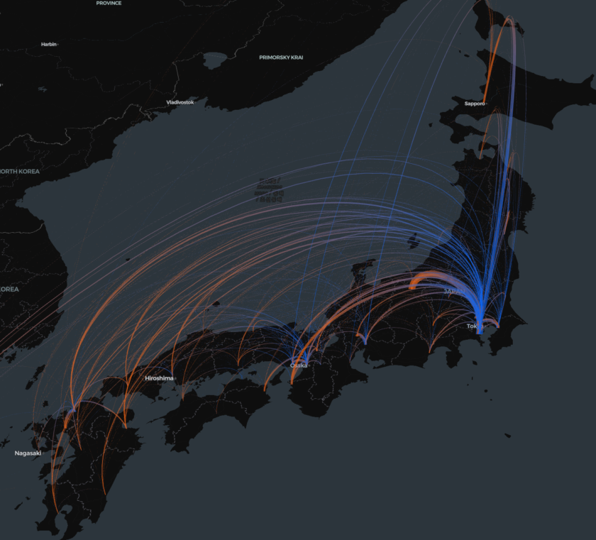 都道府県単位での移転を図に示します。相続された不動産の所在地をオレンジ色、所有者の住所を青色で示し、土地の地積と公示価格から求めた概算価格から流出入の規模を推計します。オレンジ色から青色に土地の所有権が移転していると見なすことができます。