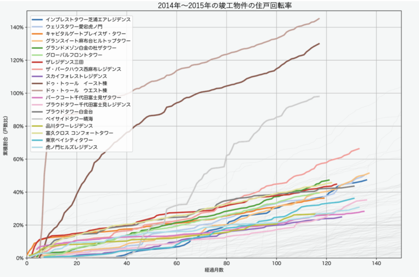 直近の2023年・2024年竣工物件は、売買率が大半において20%未満に留まっているものの、一部の物件では竣工直後にもかかわらず住戸回転率が20%を超えており、高い市場流動性が早期から発現していることが示されました。