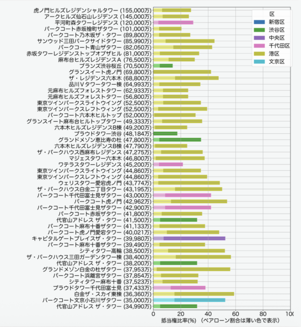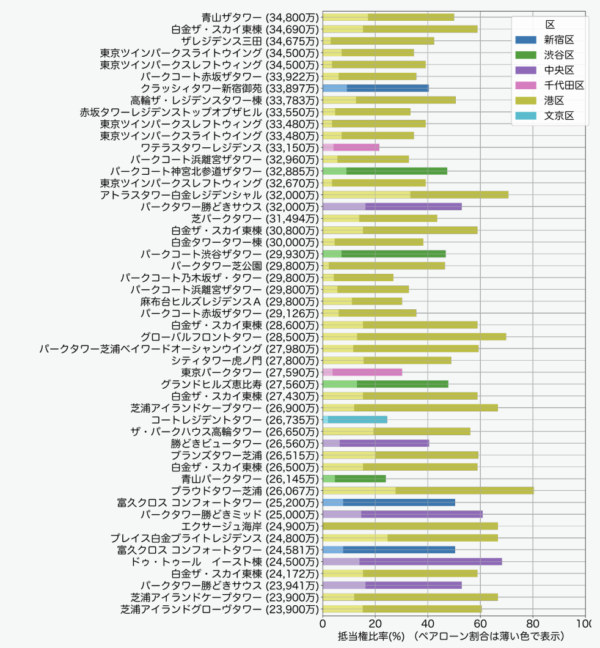 一方、参考価格2〜3億円台になると抵当権設定率が60%を超える物件も現れ、価格帯が下がるほどローン利用率が高まる傾向が確認された。港区の物件が上位価格帯に集中していた一方、参考価格1億円台後半〜2億円台前半では中央区・新宿区などの物件が多く見られ、より高い抵当権設定率を示していました。