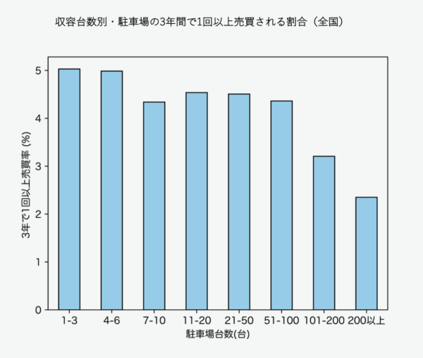 全国調査の結果、収容台数が少ない駐車場ほど売買が活発であり、さらに新規で駐車場になる土地ほど面積が小さい傾向が確認されました。小規模な土地は、住宅用地などへの転用を見据えた「暫定的な土地利用」としての側面が強く、開発用地としてのポテンシャルから高い流動性を持っています。