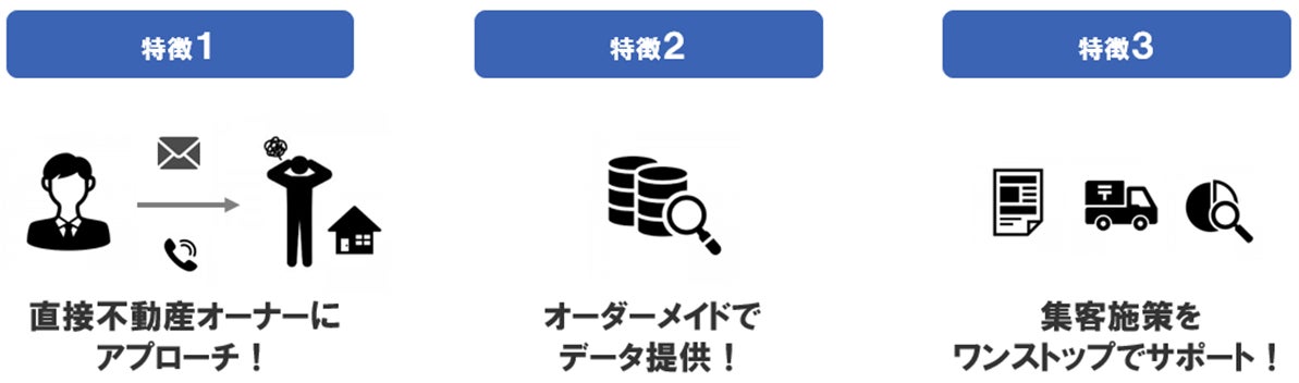 顧客企業はこの不動産データを活用することで、例えば一棟収益不動産の不動産オーナーに対して、「不動産の売却」、「管理の委託替え」、「リフォーム」、「電気やガスの見直し」を提案するダイレクトメールを送付するなど、ピンポイントな需要に対するオフラインマーケティングを効果的に実施できます。