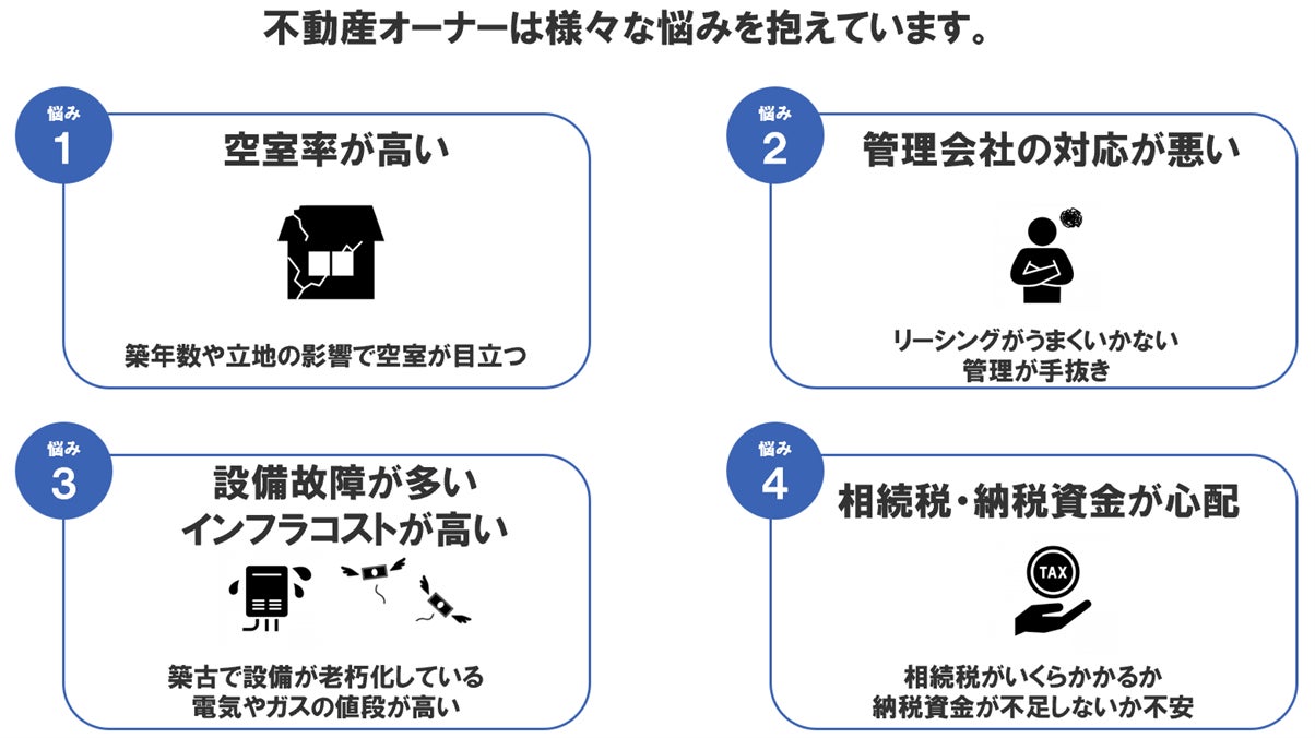 不動産を所有されている方は、多くのお悩みを抱えています。例えば、老朽化した建物の所有者は、借り手や買い手がなかなか見つからない、老朽化する設備の入れ替え、電気やガス等の料金が高い等のお悩みを抱えています。