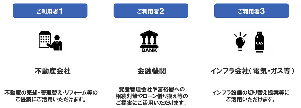 これまで不動産、金融、士業、インフラ、リユース等の様々な業界の顧客企業にサービス提供を行って参りましたが、これまでのご好評を受け、スピーディーかつリーズナブルに不動産データをご提供する新たなサービスの提供を開始いたします。
